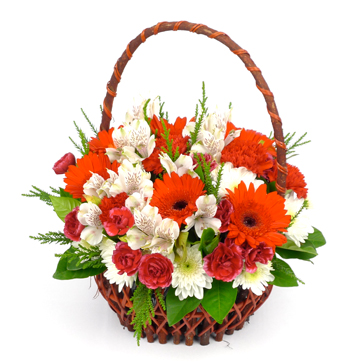 กระเช้าเยอบิร่าสีแดง และ อัลโตมิเรียสีขาว